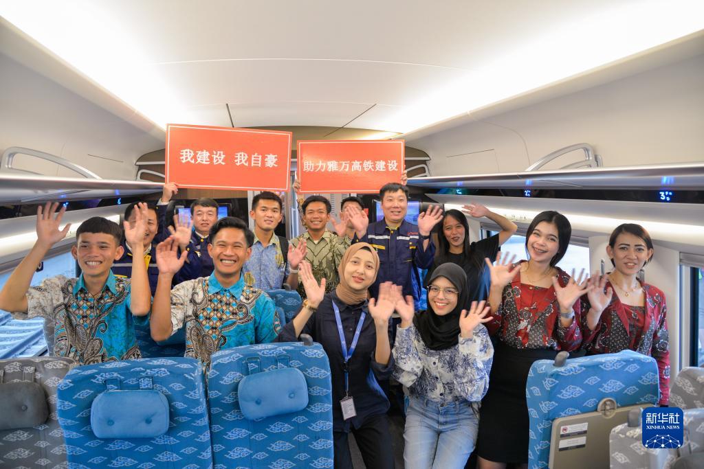 9月8日,正在印度尼西亚万隆,雅万高铁摆设单元的中邦和印尼籍员工正在一列停靠正在雅万高铁德卡鲁尔车站的高速动车组车厢内合影。新华社记者 徐钦 摄